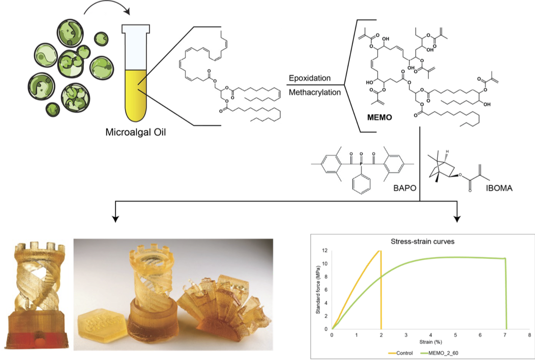 To reduce the environmental impact of additive manufacturing, we developed a photocurable SLA resin derived from microalgae oil.(Fonzo et al., 2025) Unlike petroleum or soy-based resins, microalgae do not compete with food crops for land or freshwater. This bio-based resin offers a sustainable path forward for green chemistry in 3D printing.